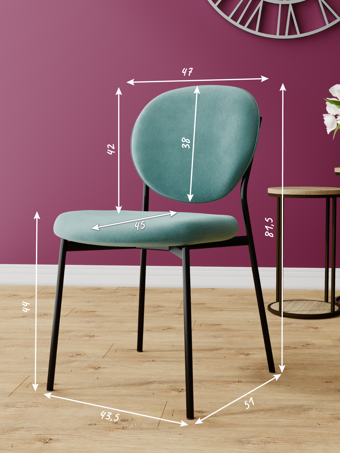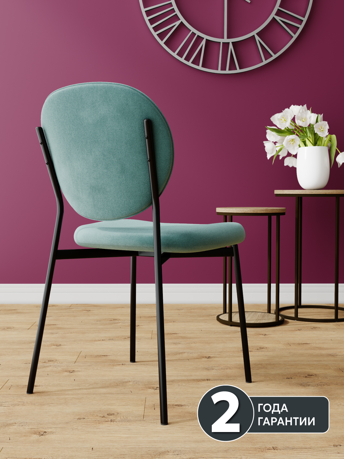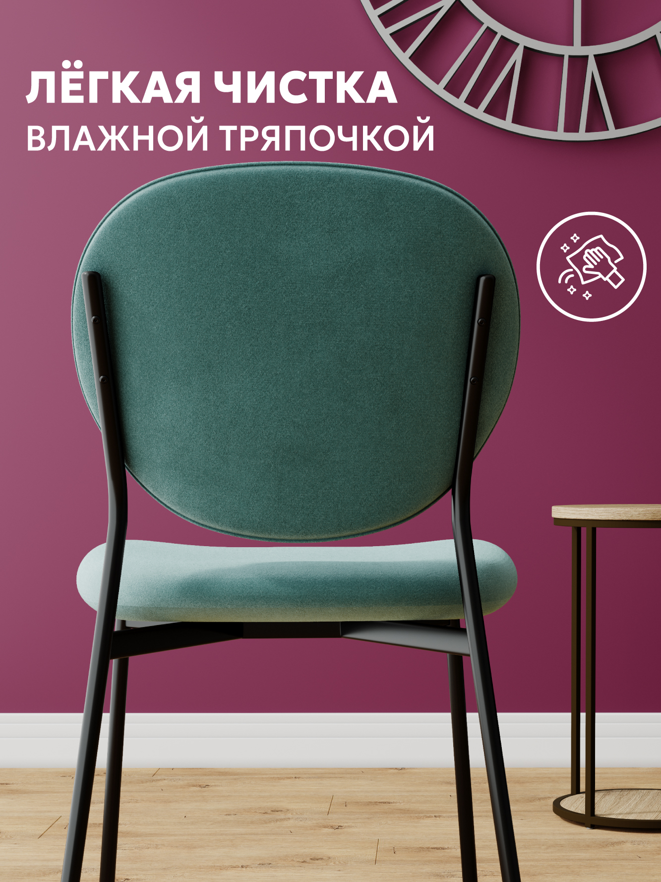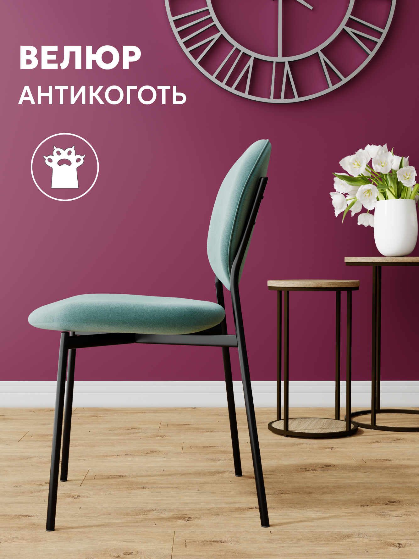 Обивка стульев изготовлена из бархатного премиум-велюра с великолепными органолептическими качествами. Длина ворса велюра подтверждается его "пальчиковым" эффектом.